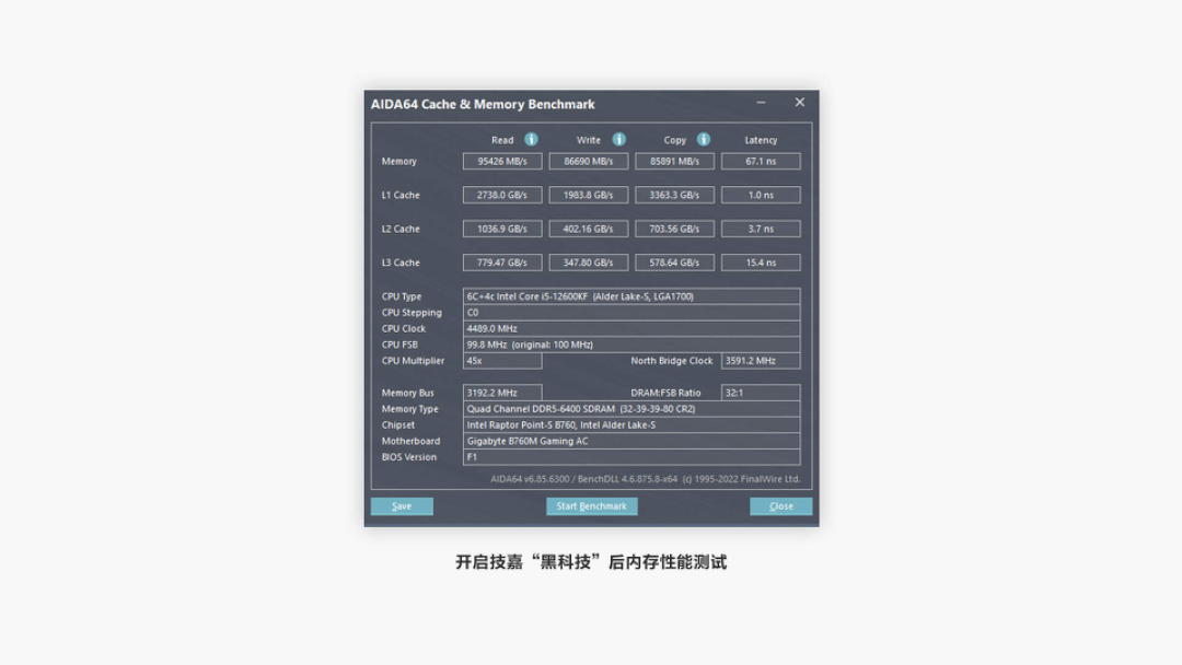 考虑技嘉的这块主板有一项高带宽低延迟“黑科技”,能够提升内存的性能,测试继续。