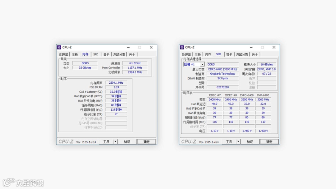 在CPU-Z工具中查看内存的硬件信息,DDR5规格,海力士Hynix A-die存储颗粒,默认频率6400MHz(双通道显示为3200MHz),工作电压1.4V,时序32-39-39-80,在6400MHz频率下,时序控制在32已经很厉害了。