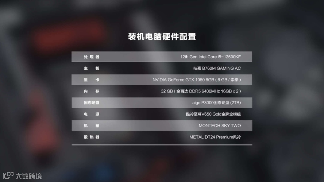 在测试性能之前,先附上测试平台的硬件配置,也是我刚攒的一台新机子,Intel i5 12600KF+技嘉B760M魔鹰WiFi主板,其他配置如上图。不过新买的显卡还在路上,暂时用之前的1060点亮开机。