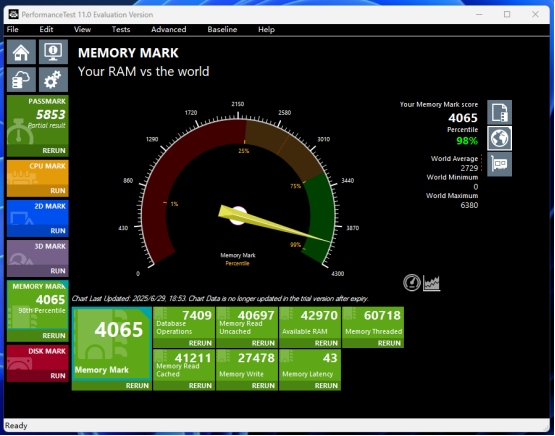 我们再来看看PerformanceTest的测试,内存跑分4065分,性能超越了全球2%的用户,这点还是相当的NICE嘛。