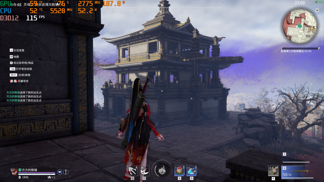超频到8000MHz后,《永劫无间》的游戏帧数其实对比7200MHz进步不算明显,但平均帧数会更稳定一些,尤其是在战斗的时候基本上都能保持在120FPS以上的频率。