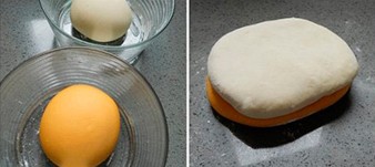 1、分别将南瓜面团和白面团的材料混合,揉成光滑有弹性的面团,进行基础发酵;