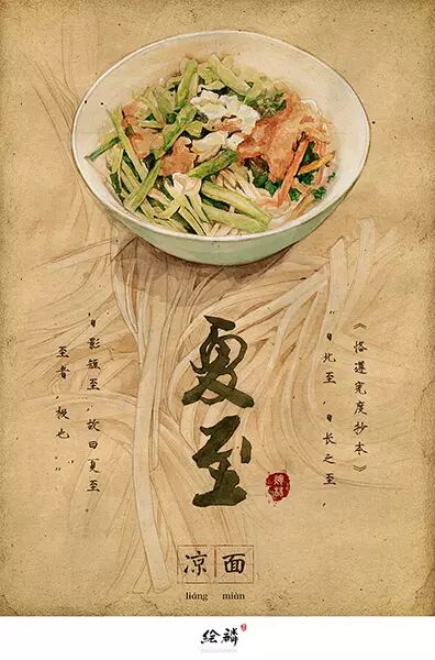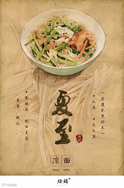 《恪遵宪度抄本》:“日北至,日长之至,日影短至,故曰夏至。至者,极也。”北方有“冬至饺子夏至面”的说法,此时气候炎热,吃些生冷之物可以降火开胃,又不至于因寒凉而损害健康。各家面馆人气很旺。