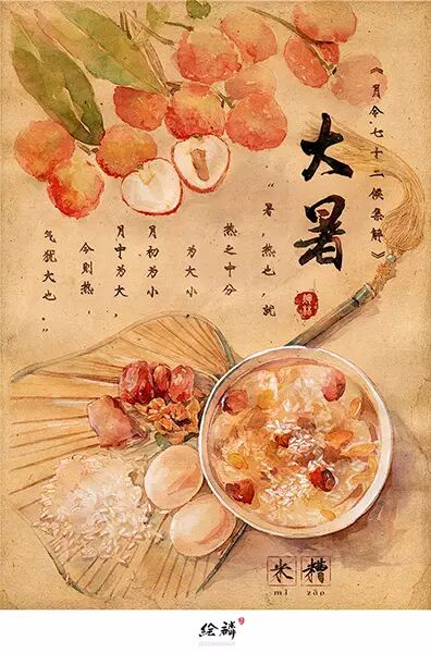 《月令七十二候集解》“暑,热也,月初为小,月中为大,今则热气犹大也。”莆田人家有在这天吃荔枝、羊肉和米糟的习俗,谓“过大暑”。此时梅雨季节刚过后不久,暑主阴,易为暑、湿、邪所侵,食以米糟驱除暑去湿。将米饭拌和白米曲发酵透熟成糟,再划成一块块加红糖煮食。