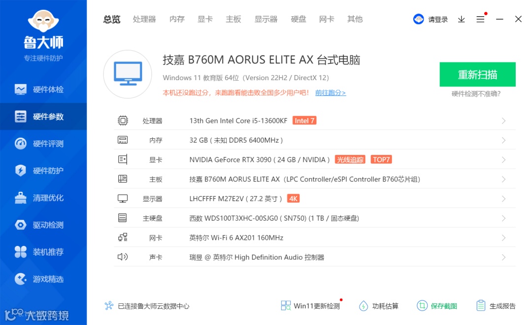 主板使用的是技嘉B760M AORUS ELITE AX WIFI,经过优化后的技嘉B760M小雕WIFI主板能支持最大7600MHz+的DDR5 OC频率,同时新的Bios对于内存超频优化更好,更方便。