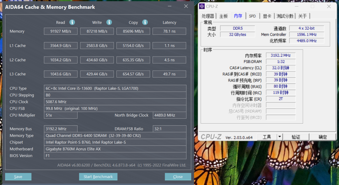 AIDA64跑分,读取91927 MB/s,写入87218 MB/s,延迟78.1ns,整体表现已经很出色了。