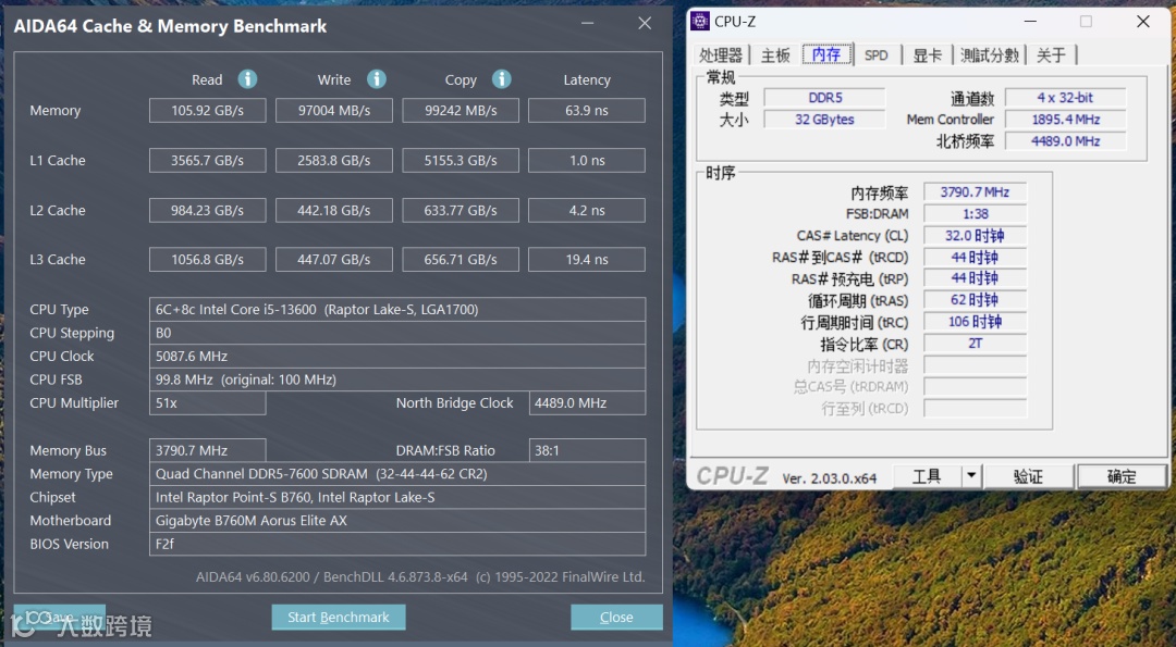 再次用AIDA64跑分,成绩已经提升到了读取105.92 GB/s,写入97004 MB/s,延迟只有63.9 ns,这个成绩可以说是非常棒了。