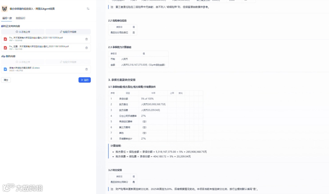 经过赛场多次真实业务场景的模拟验证(场景数据由真实客户提供),「分承保邀约智能体」针对POC测试集中的关键信息提取准确率稳定在95%以上,输出内容的质量完全达到商业场景落地的标准。智能体成功将复杂单票业务的信息处理时间从小时级缩短至分钟级,流程效率极大幅度提升,使承保业务人员得以从繁琐的查找录入工作中解放出来。