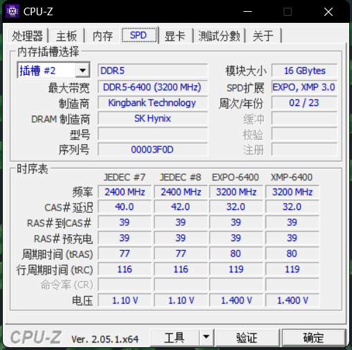 接下来开始正式测试,首先是CPU,通过SPD信息可以看到这组金百达刃使用的是SK海力士颗粒,也就是玩家经常说的A-DIE,这款颗粒是目前最适合手动超频的颗粒型号。