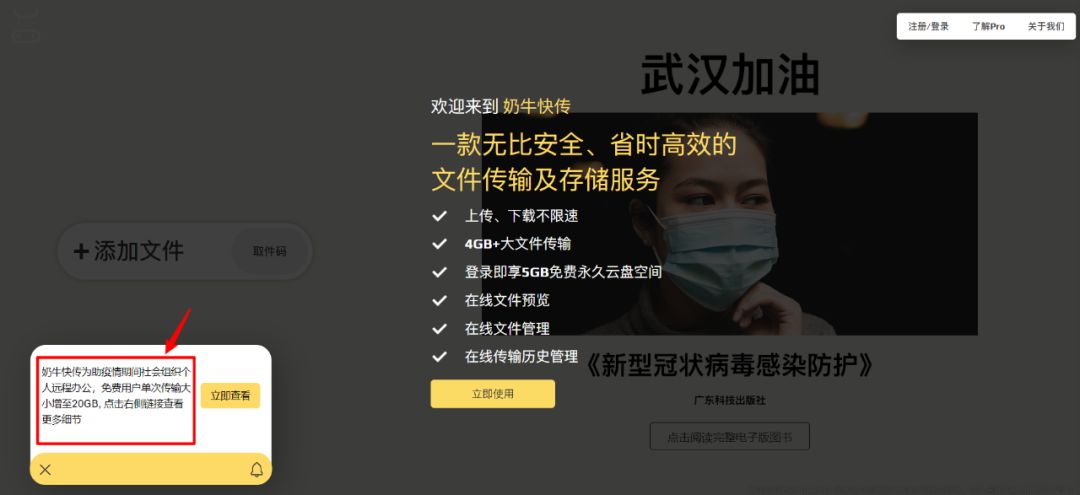 此外,为助疫情期间社会组织个人远程办公,免费用户单次传输大小增至 20 GB,基本能满足大多数文件传输的需求。