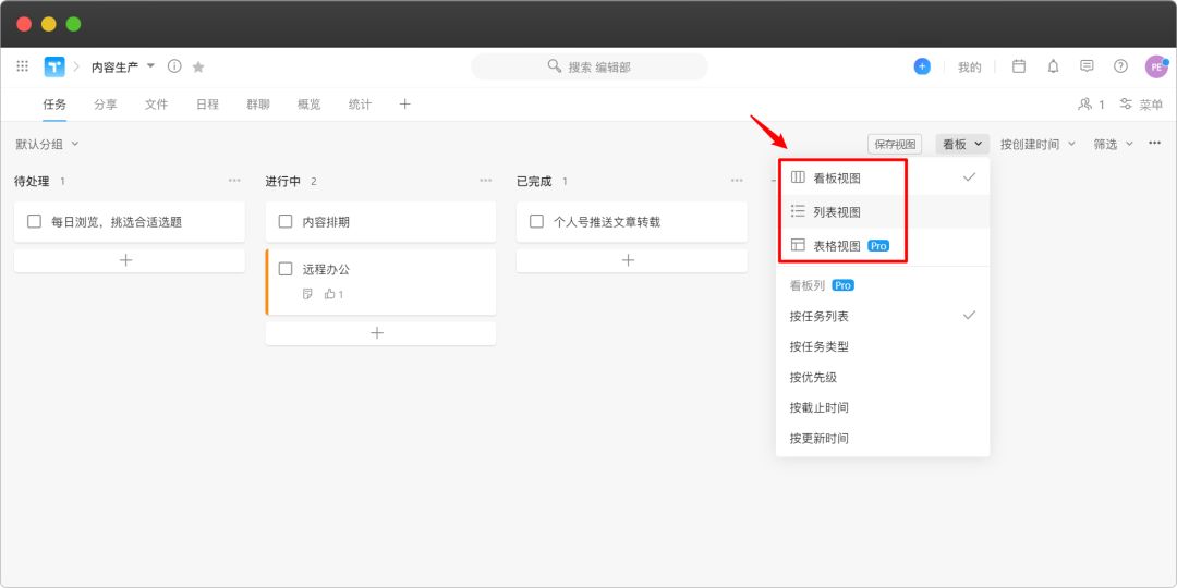在 Teambition 的项目管理页面,默认使用「看板视图」展示项目进度,点击右上角的按钮,可切换到「列表」和「表格」视图,适合不同用户的使用习惯。