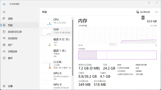 上机操作后,打开任务管理器便能发现,这套内存条的默认运行频率是4800MHz。