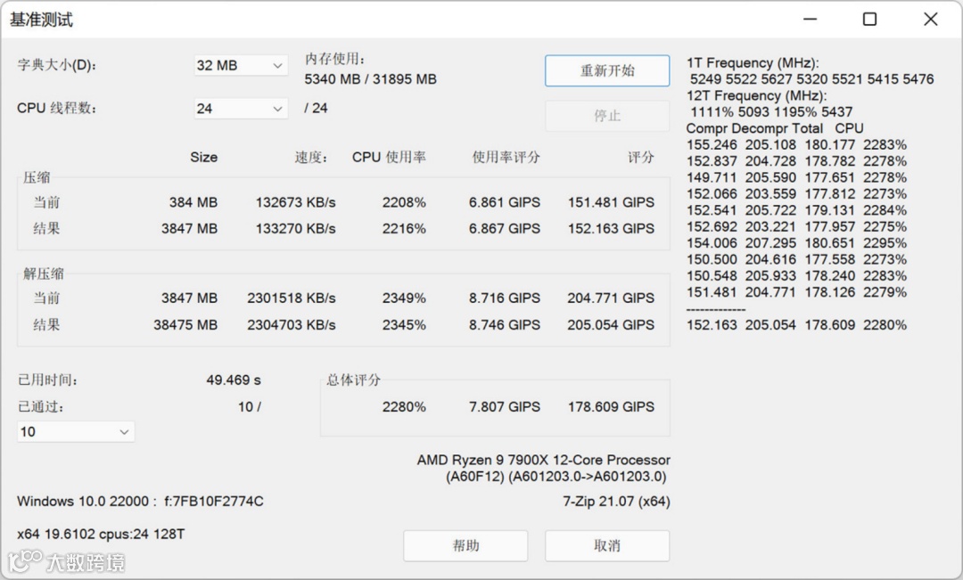 国际象棋基准测试,鉴于该软件最大只能测试16个线程,而7900X的线程数(24)超过了16,所以这里只测试单线程成绩。