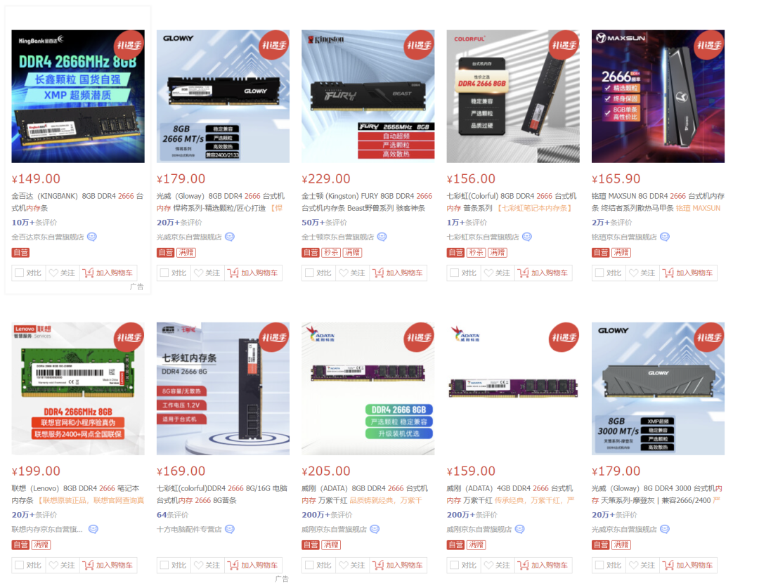 同样对比京东的价格,台资品牌在200左右,老牌金士顿要229的价格,差了大概25%-30%的价格。因此金百达这款2666内存条的价格性价比是非常高的。这个价格300就能买到8X2的双通道大内存,还要什么自行车呢!