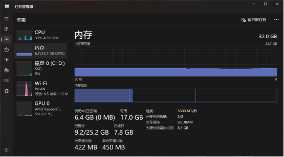 此时,进入任务管理器,我们可以看到两条内存已成功安装,且频率为5600MHz。