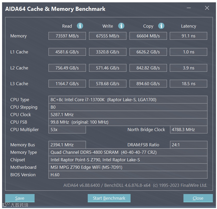 黑刃在默认4800MHz下的性能表现(时序40-40-40-77)。读取速度73597MB/s,写入速度为67555MB/s,复制速度为66604MB/s,延迟为91.1ns。