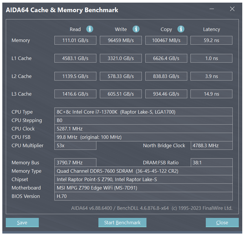 超频到7600MHz(时序36-45-45-122)。读取速度111440MB/s,写入速度为98002MB/s,复制速度为100939MB/s,延迟为61.0ns。