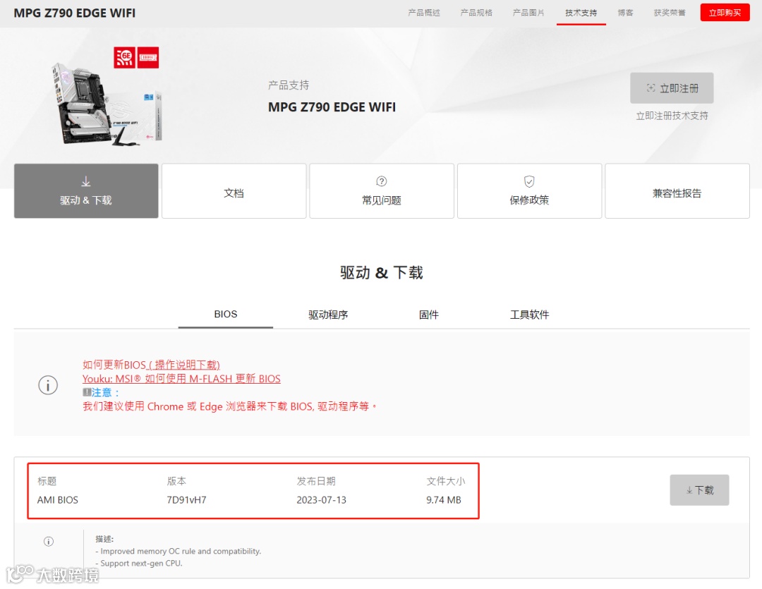 但解决方案也非常简单,升级BIOS。微星MPG Z790 EDGE WIFI的最新BIOS版本为H.70,发布时间为7月13日。