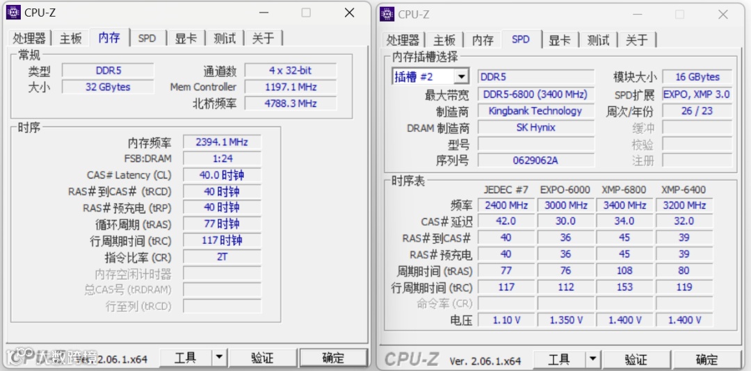 测试前先来看看这批黑刃内存的颗粒。通过AIDA64和CPU-Z都显示为海力士,默认频率为4800MHz,开启XMP后频率最高可达6800MHz。