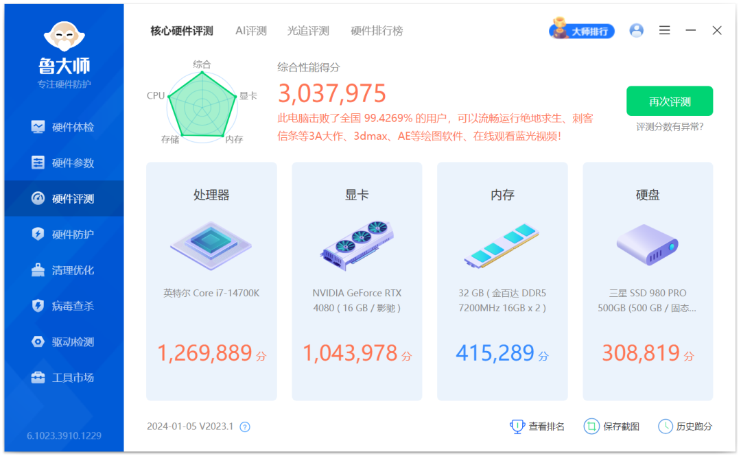 鲁大师内存得分为266101分: