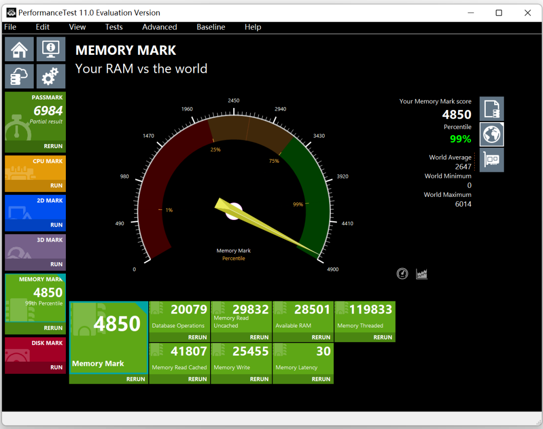 PerformanceTest 11.0内存得分为4850: