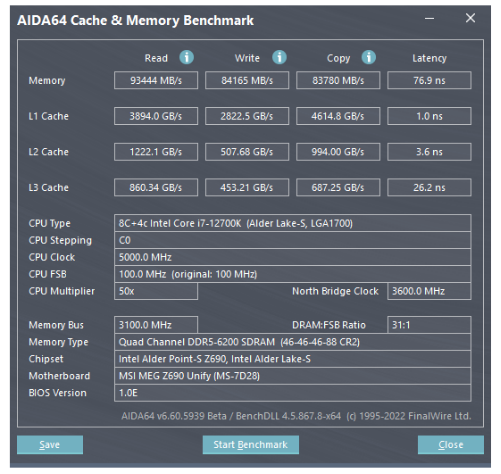 接着我又挑战了6200MHz,时序为46-46-46-88。这时候性能提升更加明显,读取速度达到了93444MB/s,写入速度达到了84165MB/s,复制速度为83780MB/s,延迟为76.9ns。