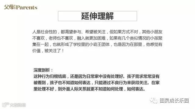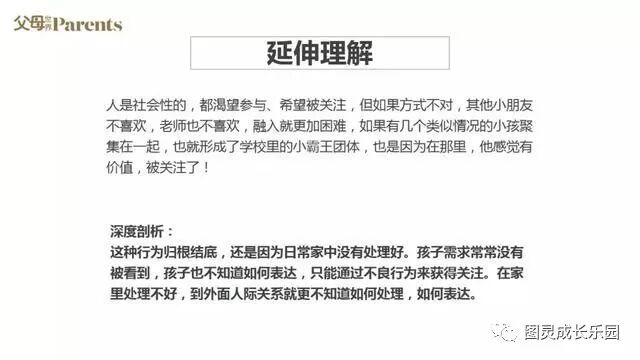 这种行为归根结底,还是因为日常家中没有处理好,孩子需求常常没有被看到,孩子也不知道如何表达,只能通过不良行为来获得关注。在家里处理不好,到外面人际关系就更不知道如何处理。