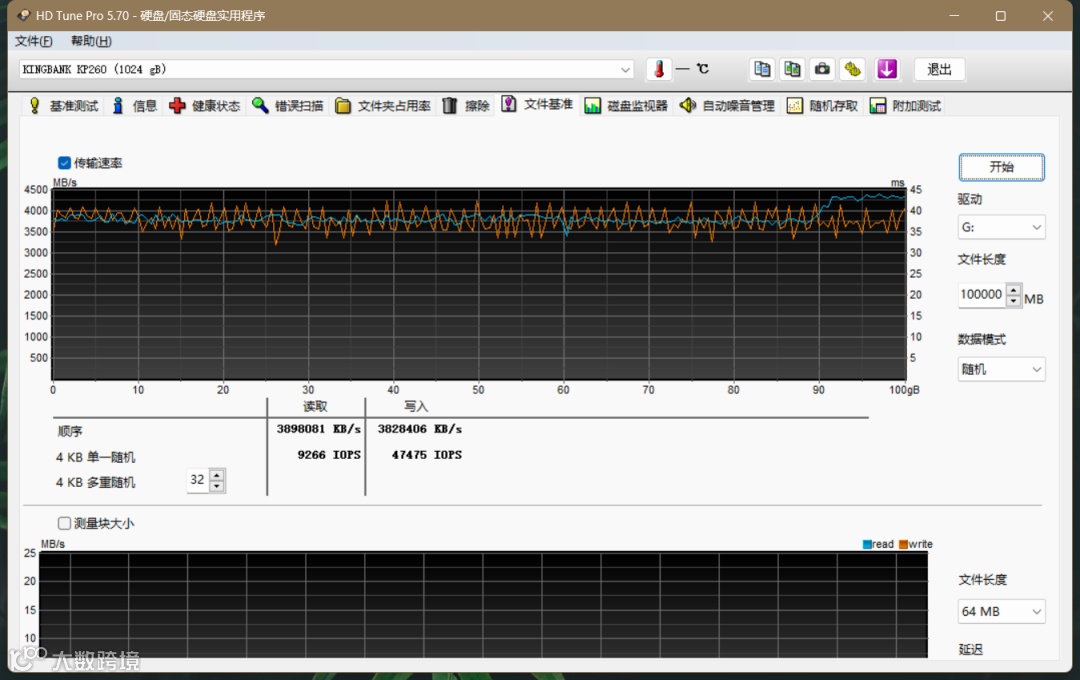 接下来我们使用HD Tune Pro测试金百达KP260 1TB SSD SLC Cache极限,数据模式选取随机,将数据块大小定为100GB,可以看到在单个100GB大小文件块传输下,无论是读写都十分平稳不掉速,这说明其NAND颗粒与主控性能表现都十分稳定。
