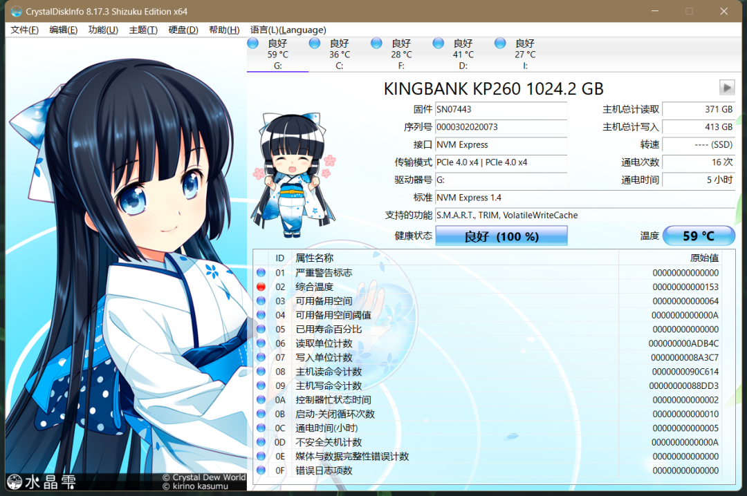 先来看看金百达KP260 1TB硬盘的参数,我们使用CrystalDiskinfo查看可以得知,它采用PCIe Gen4X4规格,标准为NVMe1.4,支持S.M.A.R.T.,TRIM,VolatileWriteCache等功能。