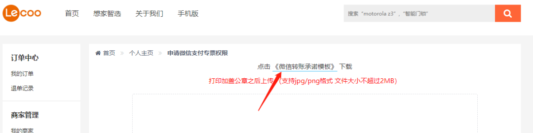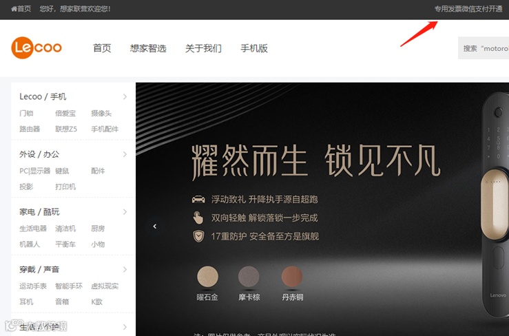 第一步,登陆想家智选商城PC页面,在页面顶端会有一个专用发票微信支付开通的选项。