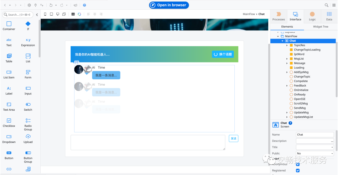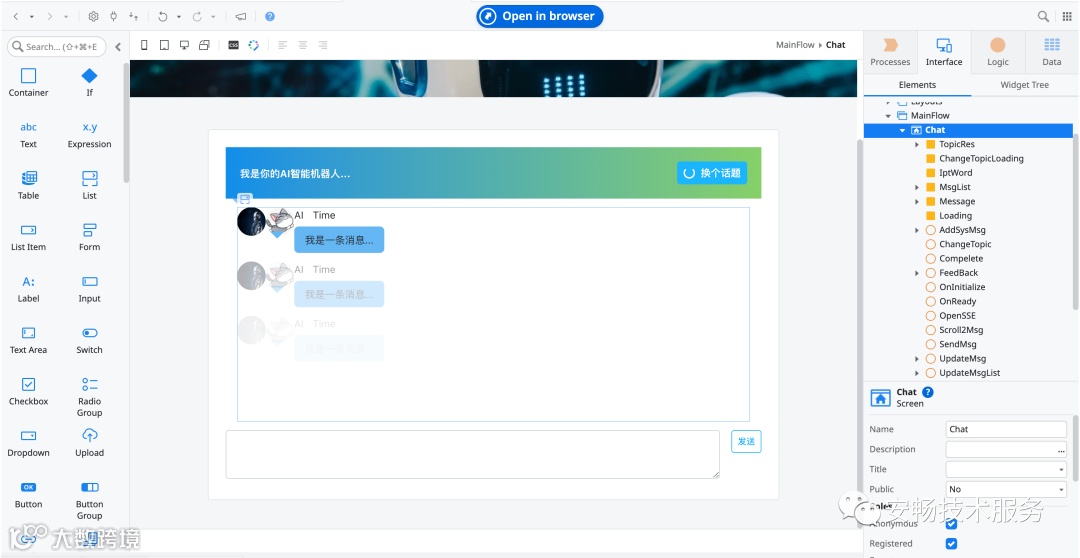 这里我们可以看到界面主要包含三部分:页面标题、聊天内容展示区域、聊天内容输入及发送部分。通过右侧的widget tree可以看到主要分别拖入contianer、button、list、area等组件完成界面的基本搭建。根据业务逻辑可以在tree中插入IF组件来控制部分组件的显示效果。