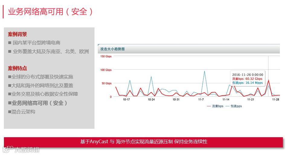 还有业务的安全与高可用,前几天我们看到网上在讨论京东12G的数据泄漏,对他们这些巨头都是很大的挑战和问题。所以我们在所有核心网络节点部署了一套安全的防御系统,首先,我们部署了入侵防护监测和入侵防护拦截系统以及扛DDoS系统,这套系统是所有用户进来的时候都要经过我们的安全中心,如果我们发现有人访问你的设备或者是非正常方式连接和猜解您的设备,系统都会以全自动化的方式进行拦截与防御。其次,当遇到了攻击,在我们所有的安全中心都会提供清洗与防护的服务,客户被攻击了肯定不希望业务被影响掉,所以我们不会以改变当前网络情况下的情况下对攻击进行拦截或防护。其实大多平台型的跨境电商对业务平台及服务的稳定性要求不亚于在线交易,所以对我们的要求也并不低于金融多少。所以,当以往客户被攻击的时候,流量可以迁移到其他国家。但对电商来讲,被攻击的时候不可以改变网络环境,因为改变网络环境,影响交易,虽然网实际上抵御了攻击,但客户照样无法正常提供服务,这对我们而言也带来了很大的挑战