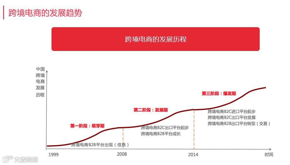 我们认为国内的跨境电商分三个阶段:第一个阶段,99年到08年,这个阶段比较典型的就是阿里巴巴的国际站,它走出了跨境电商的第一步;第二个阶段,08年到14年,诞生了很多像兰亭集势,DX等这样的企业;第三阶段,爆发期,随着跨境电商的起步和完善,还有消费升级,因为中国的互联网网购人群已经将近5个亿,而这些客户中的网购率是非常高,这里面产生了很多的新型企业,比如说网易考拉、洋码头、小红书等等。