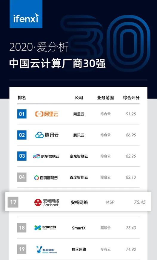 4月15日,中国领先的产业数字化研究与咨询机构,爱分析正式发布《2020中国云计算厂商榜》,涵盖阿里云、腾讯云、百度智能云、安畅网络等国内30家优秀云计算厂商。面向企业客户提供从IaaS、PaaS到SaaS的全栈式的云原生技术服务和数字化解决方案的安畅网络,凭借优异的技术实力与服务能力,成为云托管服务(Cloud MSP)领域唯一登榜企业。