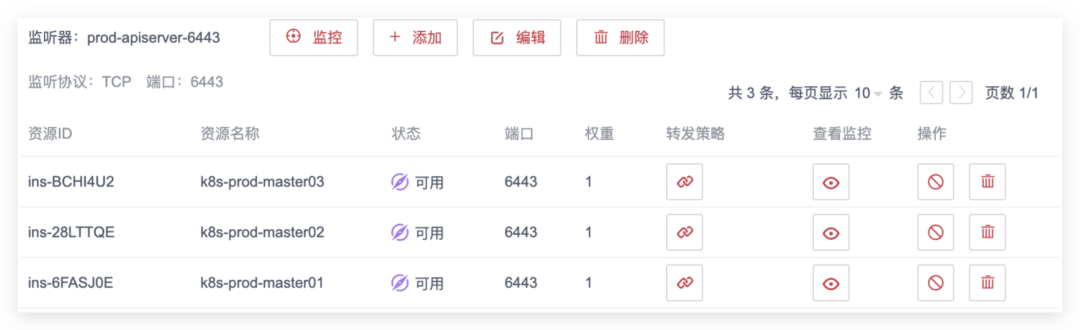 在此利用了开源的KubeSphere一键部署高可用架构,配合公有云的或私有云的LB来实现高可用架构,快捷高效,后期支持动态的新增Node节点,免去了K8s基础设施部署的复杂性,如图为私有LB添加的K8s集群master的api-server的端口,保证集群高可用。