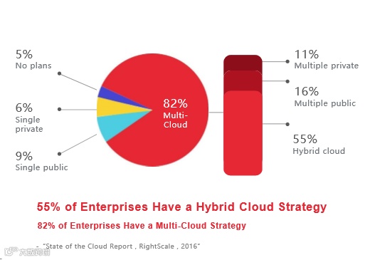 根据RightScale在2016年的调研报告,混合云的采用率呈上升趋势。有95%的受访者在使用云计算,混合云的使用率从去年同期的58%跃升至71%。在采用云计算的过程中,中大型企业和组织出于技术性能、安全、合规、保护已有IT资产以及避免被单一供应商锁定等因素,混合云或多云将是IT部门的首选策略。