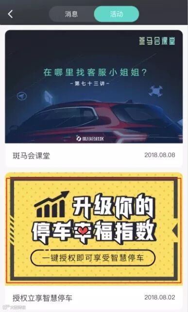 ②“发现”页面右上角点击消息图标,进入“活动”,也可找到智慧停车授权入口