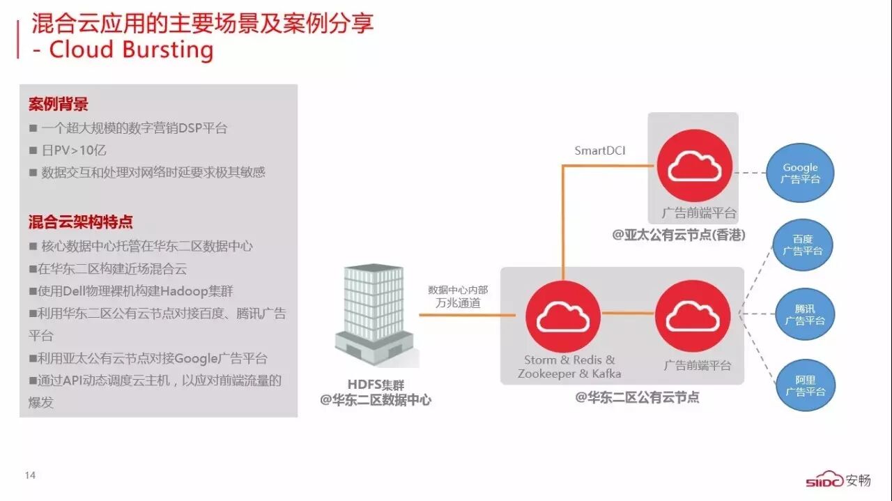 第三个是一个偏互联网的场景,主题是Cloud Burst,一个做数字营销大数据的公司。规模非常大,每天有10亿PV,客户的系统最前端是对接google、百度、阿里、腾讯等所有广告流量的平台,中间是消息处理平台,最后端是一个Hadoop集群。这样的架构,最开始是跑在公有云上的,跑了一年左右,流量负载和数据处理规模上到一定程度后,公有云平台在性能上已经cover不住了,因为他所有节点与节点间带宽的吞吐量都要在10G左右,因此我们当时把他的架构做了拆分。把Hadoop这部分拆到了线下的物理机,用物理服务器帮他们做了一个高性能集群;前端把它拆为两部分,把Storm & Redis这些平台还是放在公有云上,可以利用公有云的弹性,再前端的一些广告的平台也放到了公有云上面。从最前端系统到中间的处理系统到最后面的大数据,非常有层次的跑在混合云上面。