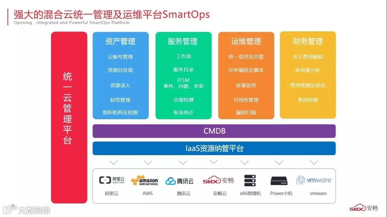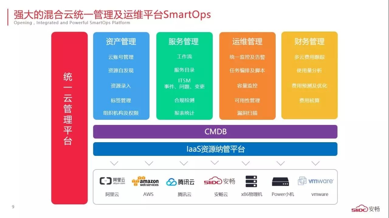 第二个就是平台,针对混合云的统一管理平台,如果没有这样一个平台,跨异构资源、跨平台管理会变得非常的低效和麻烦。我们针对国内的混合云生态和业务场景,构建了SmartOps平台,支持IaaS层多云的接入,包括公有云、私有云、物理服务器,甚至IBM Power小机,往上是云环境下的各种统一监控、安全的运维模块,资产管理,服务管理和财务管理。