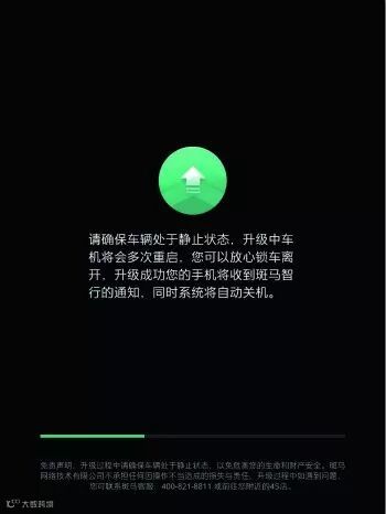 小斑:您可以放心锁车离开,当升级成功后,系统将自动关机,您的手机也将收到来自斑马智行的通知