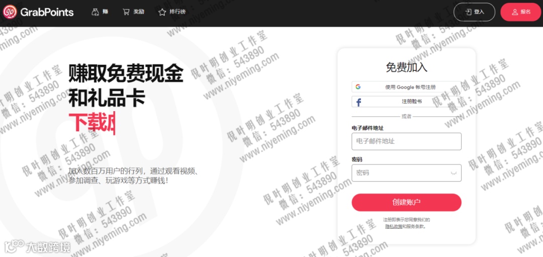 用户可通过Google、Facebook账号或海外邮箱直接注册登录GrabPoints平台。