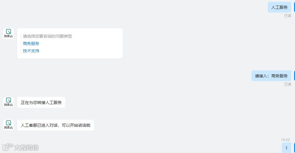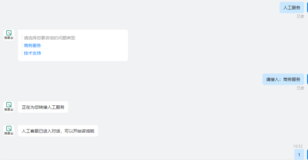 3、关注后直接在对话界面输入您想要咨询的问题,即可收到自动回复解答。如当前答案未能解决您的问题,请输入“人工服务”,进线与技术或商务人员沟通解决您的问题。如图: