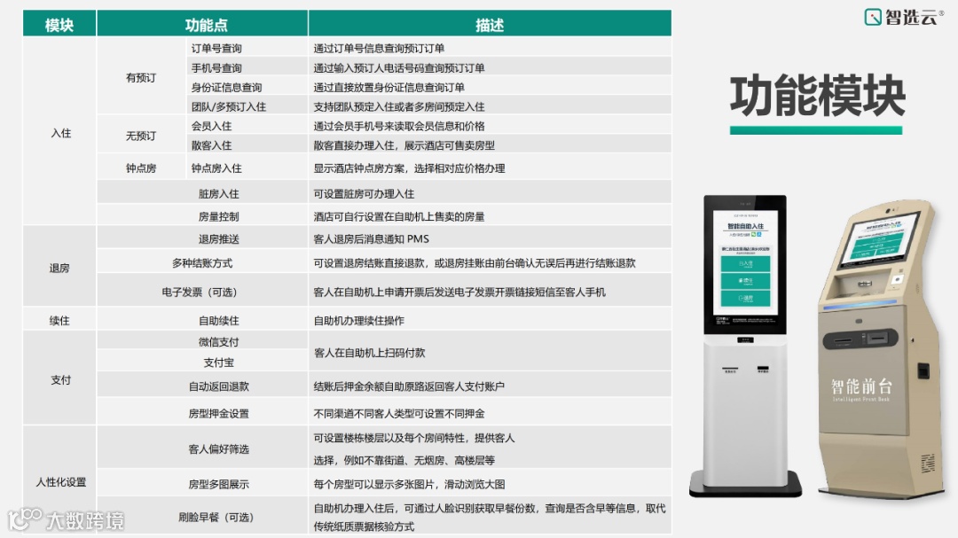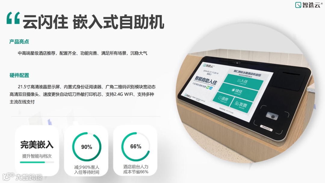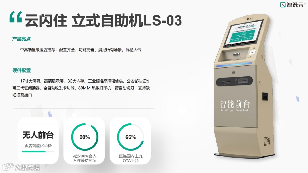 智选云自助入住机都具备完善的功能,可直连OTA平台,完全解放前台,同时与智选云PMS打通,大大节省人力成本。