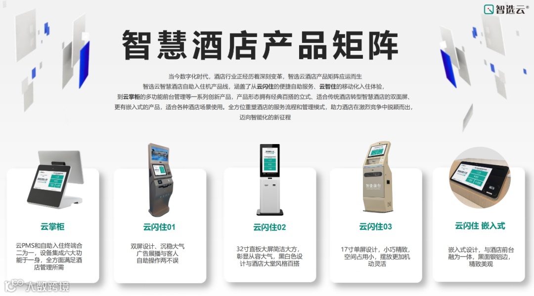 时代在进步,酒店业在转型,智能化已经成为不可阻挡的趋势。智选云,作为行业创新的引领者,在此我们自豪地为您呈现强大的自助入住机产品矩阵。当前智选云旗下拥有众多自助入住机产品,能够满足各种中高端酒店以及应用场景。