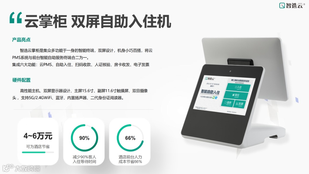 首先向大家介绍 - 云掌柜。这是一款双屏自助入住机集众多功能于一身的智能终端。它采用双屏设计,机身小巧百搭,将智选云PMS系统与前台智能自助服务终端完美合二为一。 集成了云PMS、自助入住、扫码收款、人证核验、房卡收发、电子发票六大核心功能。