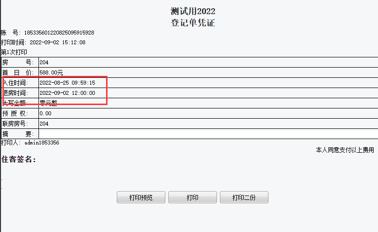 选择“热敏打印机模式”,打印登记入住单的时候,显示入住时间
