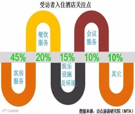 调查结果显示人们入住酒店最关心其服务质量。从具体服务版块来看,最关心客房服务的人数占比为45%。另外餐饮服务、娱乐设施及环境、会议服务占比分别为20%、15%以及10%。其它占比为10%。
