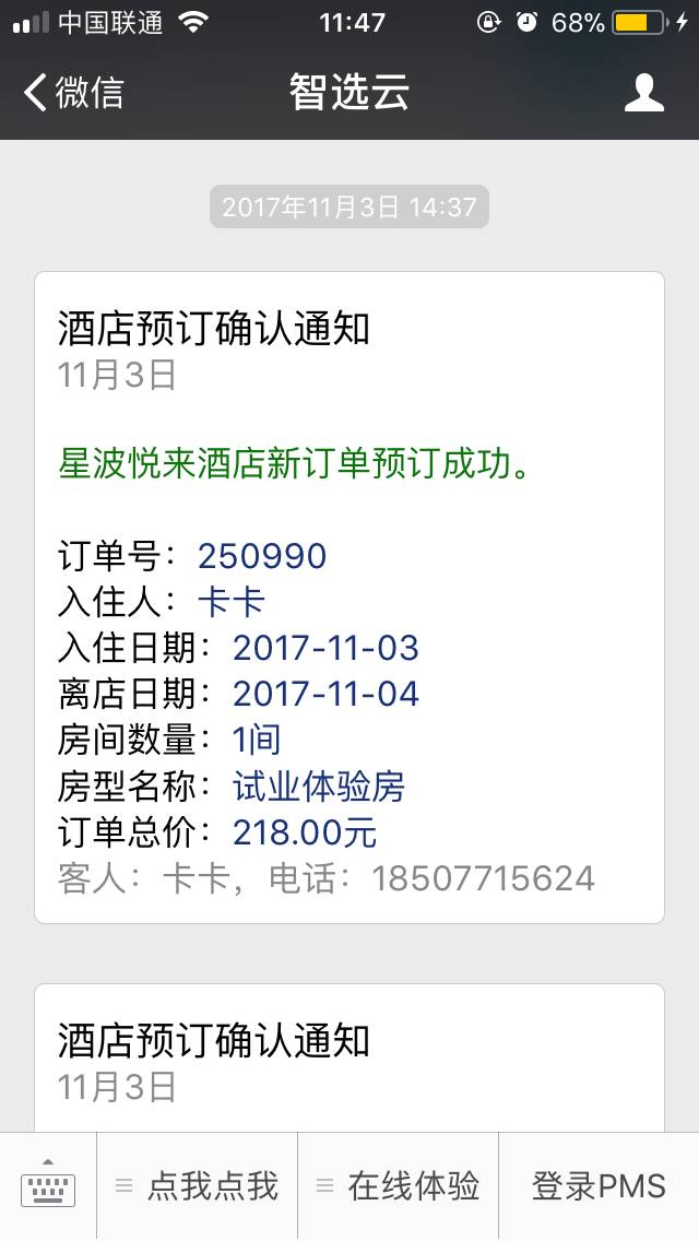 9、已绑定的微信用户,可在产生酒店微信订单时,在“智选云”公众号收到订单通知。