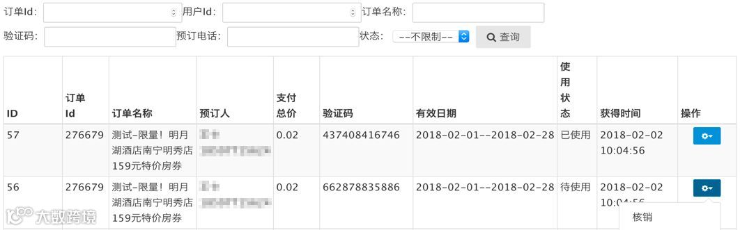 前台登录PMS系统“微信营销”板块,点击“验证码核销”。列表包含订单编号、订单名称、预订信息、验证码、有效日期,当状态为“待使用”时,可操作“核销”。核销后状态不能修改,请确认信息后再操作。