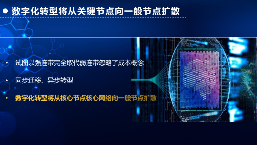 数字化迁移会将物理世界中越来越多的节点吸引到数字世界中,但这些被吸引到数字世界中的新的节点,与已经在数字世界中的其他节点,一般意义上仍会是弱连带关系,而很难形成强连带关系。因此,数字化迁移的进程可以是同步推进的。